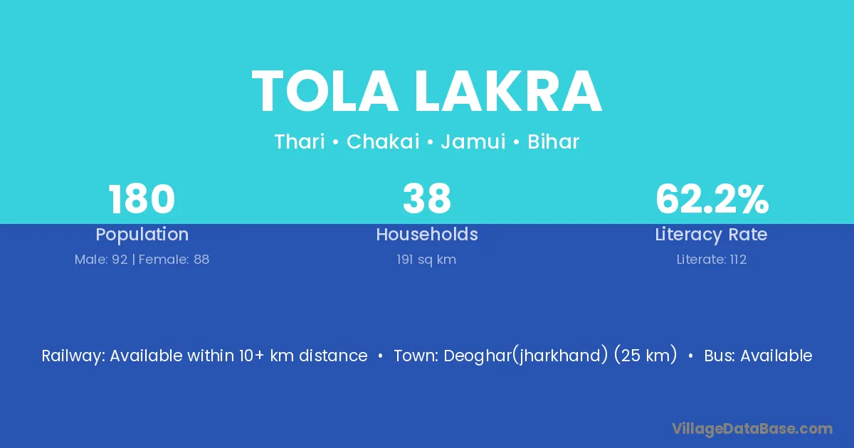 Deoghar(jharkhand) (25 km) is the nearest town to Tola Lakra village for major economic activities and is located approximately 25 km away.