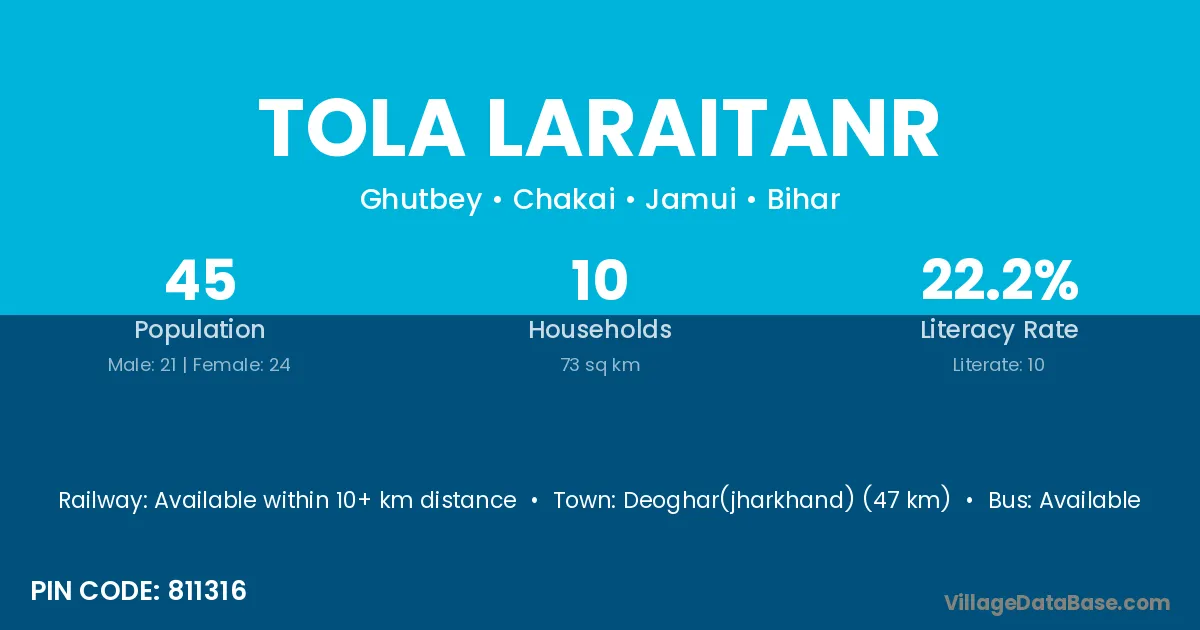 Deoghar(jharkhand) (47 km) is the nearest town to Tola Laraitanr village for major economic activities and is located approximately 47 km away.