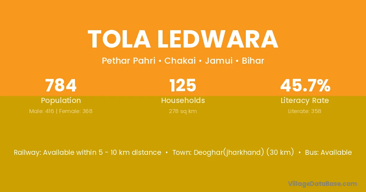 Deoghar(jharkhand) (30 km) is the nearest town to Tola Ledwara village for major economic activities and is located approximately 30 km away.