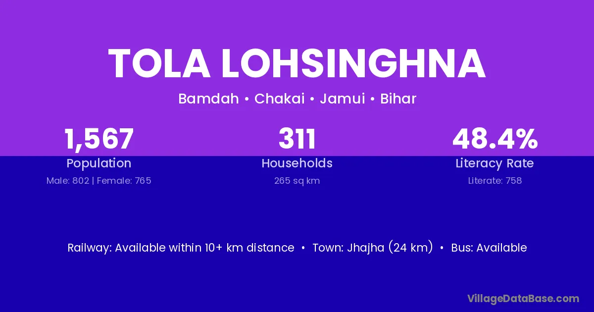 Jhajha (24 km) is the nearest town to Tola Lohsinghna village for major economic activities and is located approximately 24 km away.