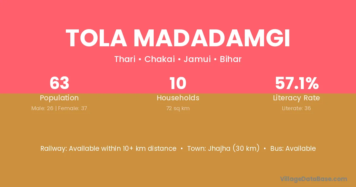 Jhajha (30 km) is the nearest town to Tola Madadamgi village for major economic activities and is located approximately 30 km away.