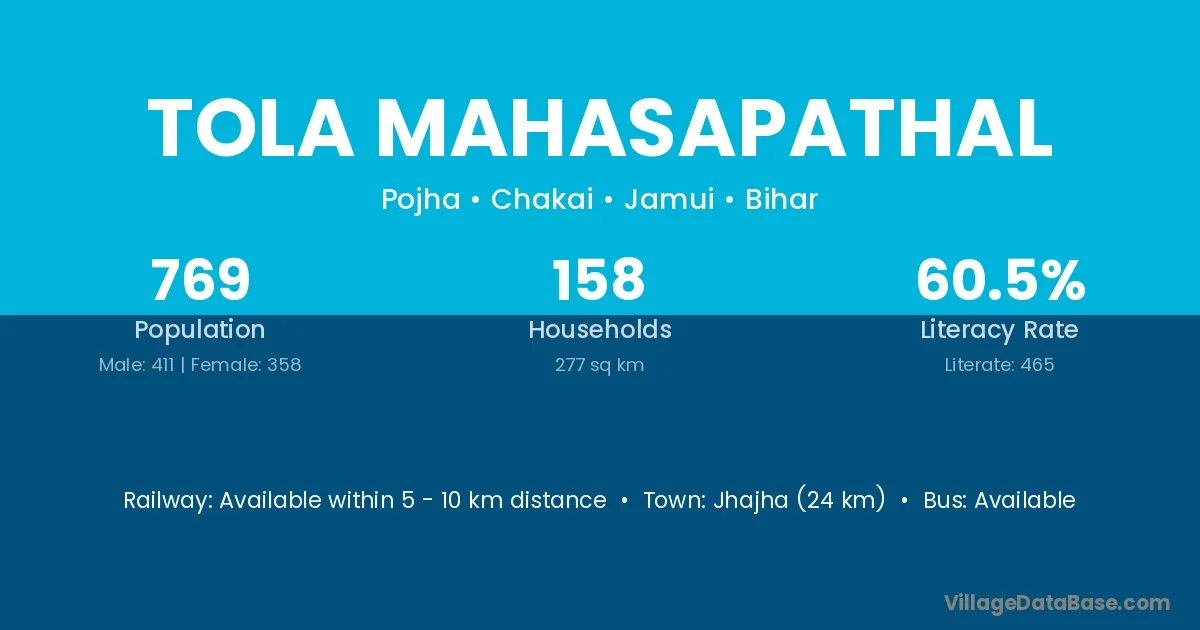 Jhajha (24 km) is the nearest town to Tola Mahasapathal village for major economic activities and is located approximately 24 km away.