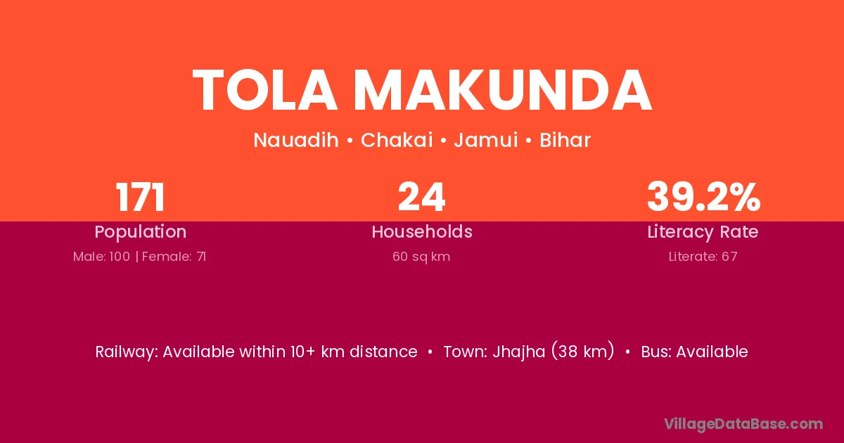 Jhajha (38 km) is the nearest town to Tola Makunda village for major economic activities and is located approximately 38 km away.