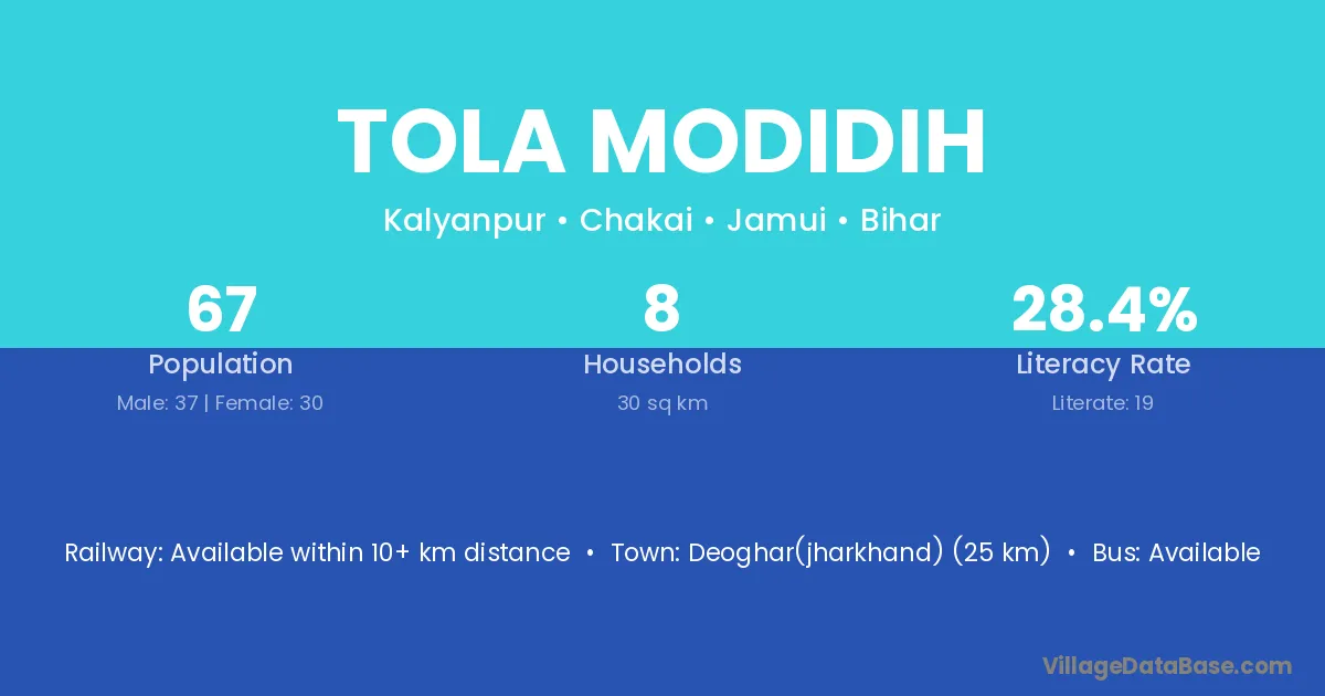 Deoghar(jharkhand) (25 km) is the nearest town to Tola Modidih village for major economic activities and is located approximately 25 km away.
