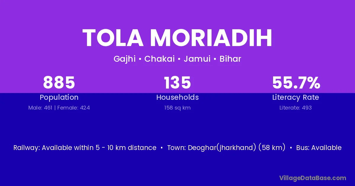 Tola Moriadih village has a total population of 885 people, of which 461 are males and 424 are females.