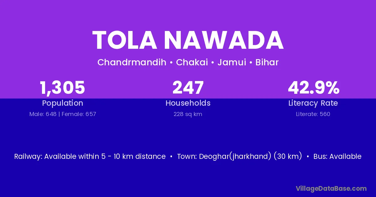 Tola Nawada village has a total population of 1,305 people, of which 648 are males and 657 are females.