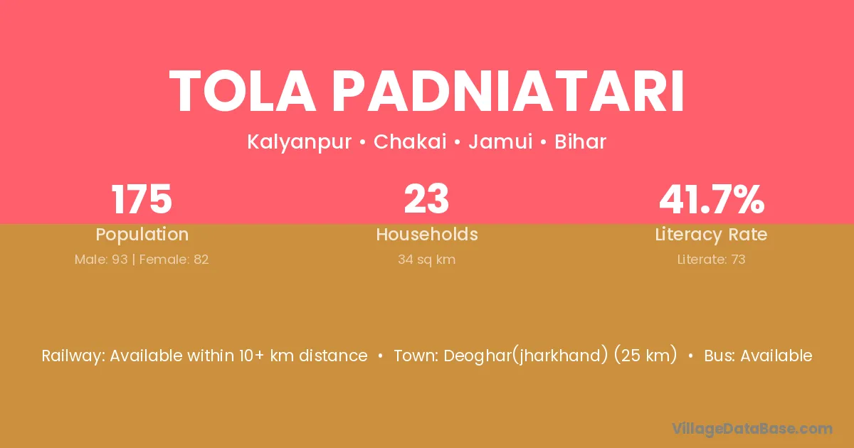 Deoghar(jharkhand) (25 km) is the nearest town to Tola Padniatari village for major economic activities and is located approximately 25 km away.