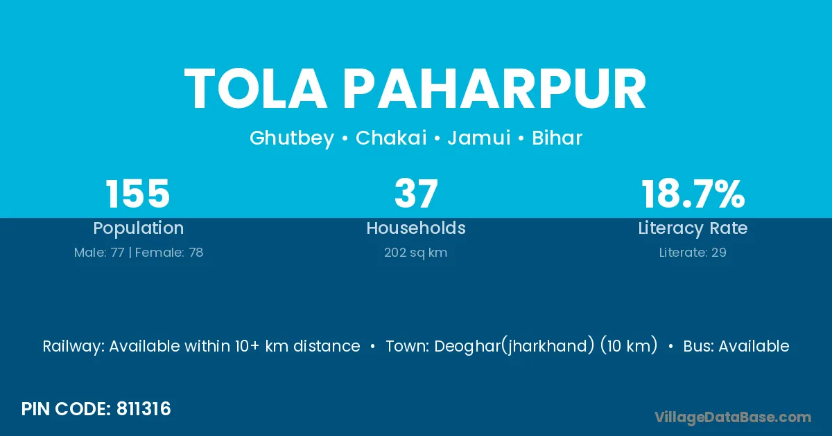 Deoghar(jharkhand) (10 km) is the nearest town to Tola Paharpur village for major economic activities and is located approximately 10 km away.