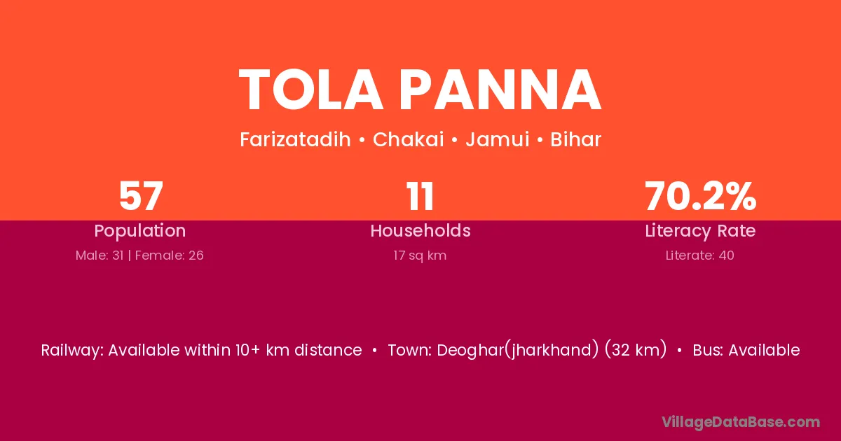 Deoghar(jharkhand) (32 km) is the nearest town to Tola Panna village for major economic activities and is located approximately 32 km away.