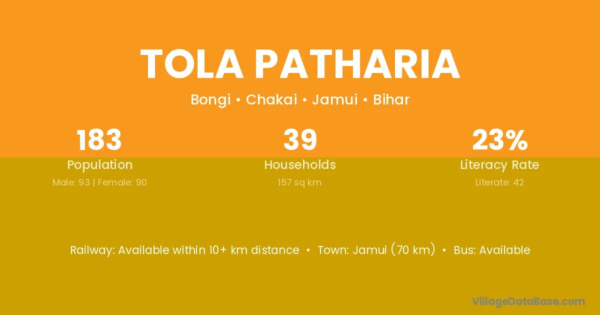 Jamui (70 km) is the nearest town to Tola Patharia village for major economic activities and is located approximately 70 km away.