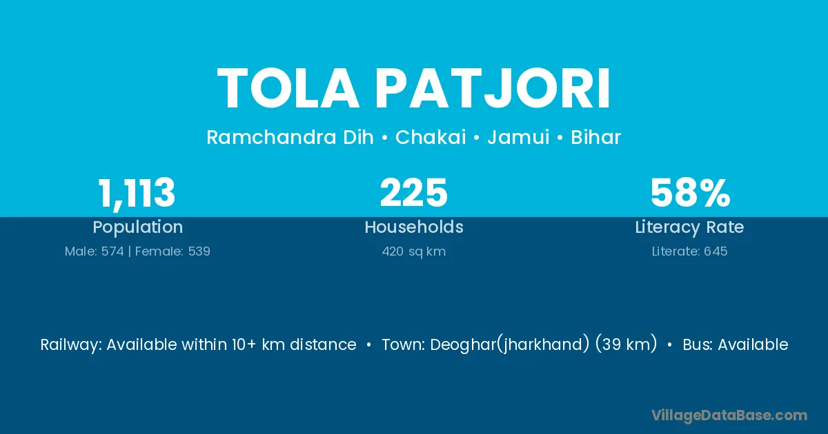 Deoghar(jharkhand) (39 km) is the nearest town to Tola Patjori village for major economic activities and is located approximately 39 km away.