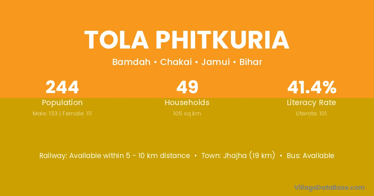 Jhajha (19 km) is the nearest town to Tola Phitkuria village for major economic activities and is located approximately 19 km away.