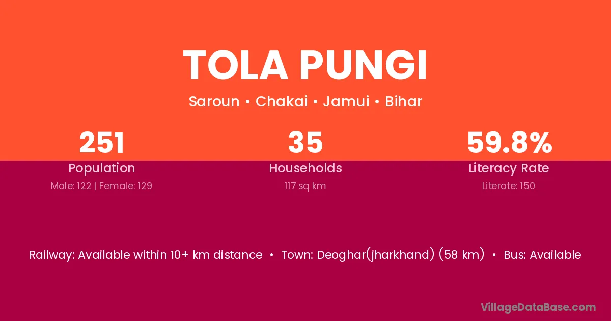 Deoghar(jharkhand) (58 km) is the nearest town to Tola Pungi village for major economic activities and is located approximately 58 km away.