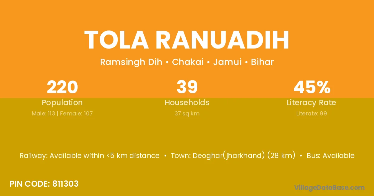Deoghar(jharkhand) (28 km) is the nearest town to Tola Ranuadih village for major economic activities and is located approximately 28 km away.