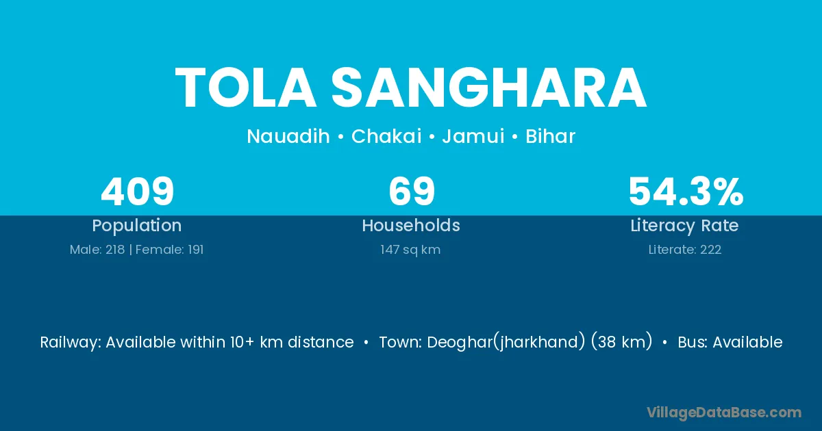 Deoghar(jharkhand) (38 km) is the nearest town to Tola Sanghara village for major economic activities and is located approximately 38 km away.