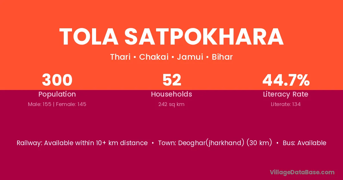Tola Satpokhara village has a total population of 300 people, of which 155 are males and 145 are females.