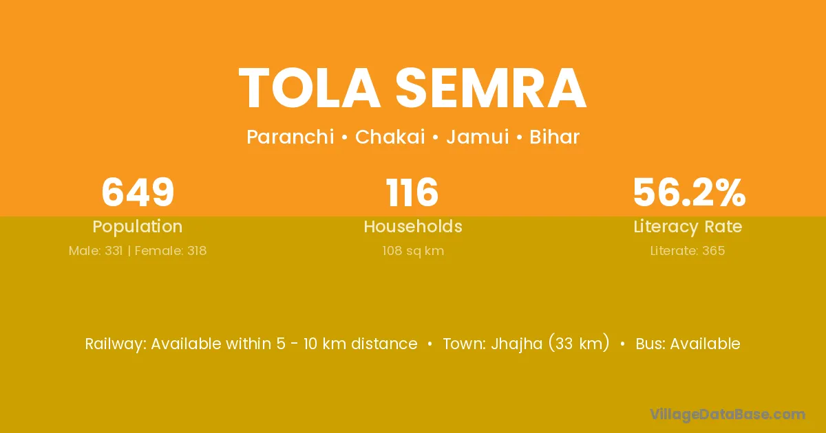 Jhajha (33 km) is the nearest town to Tola Semra village for major economic activities and is located approximately 33 km away.