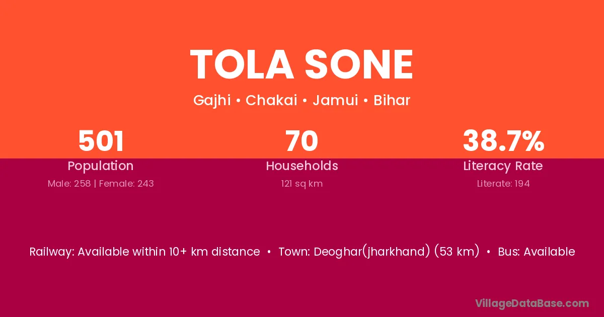 Deoghar(jharkhand) (53 km) is the nearest town to Tola Sone village for major economic activities and is located approximately 53 km away.