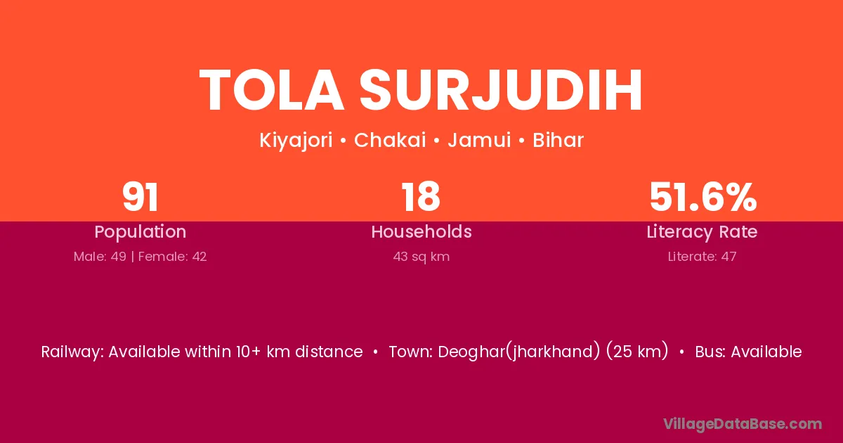 Tola Surjudih village has a total population of 91 people, of which 49 are males and 42 are females.