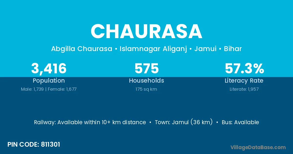 Jamui (36 km) is the nearest town to Chaurasa village for major economic activities and is located approximately 36 km away.