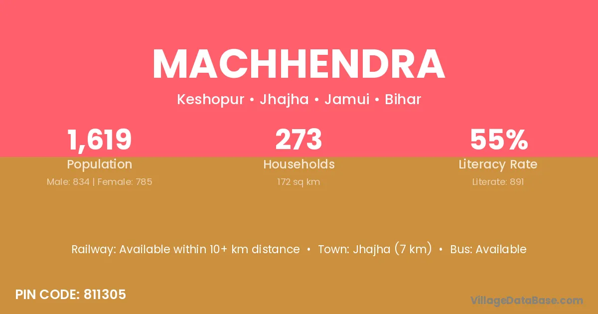 Jhajha (7 km) is the nearest town to Machhendra village for major economic activities and is located approximately 7 km away.