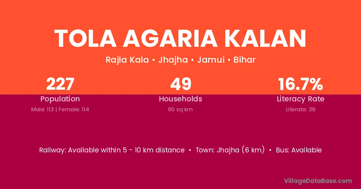 Tola Agaria Kalan village has a total population of 227 people, of which 113 are males and 114 are females.