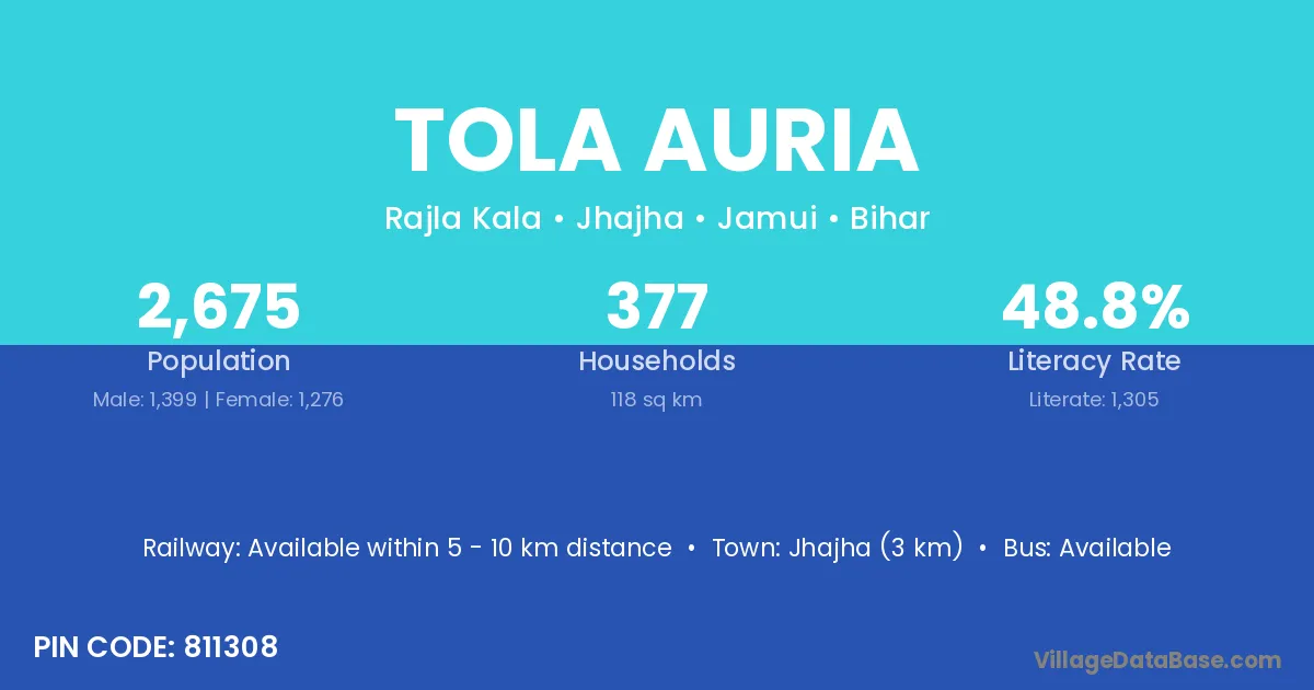 Jhajha (3 km) is the nearest town to Tola Auria village for major economic activities and is located approximately 3 km away.