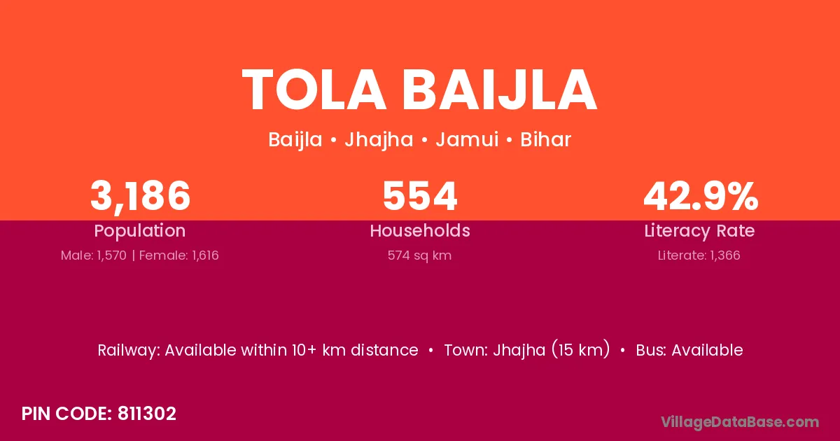 Jhajha (15 km) is the nearest town to Tola Baijla village for major economic activities and is located approximately 15 km away.