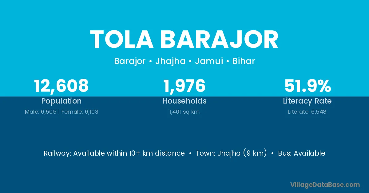 Jhajha (9 km) is the nearest town to Tola Barajor village for major economic activities and is located approximately 9 km away.