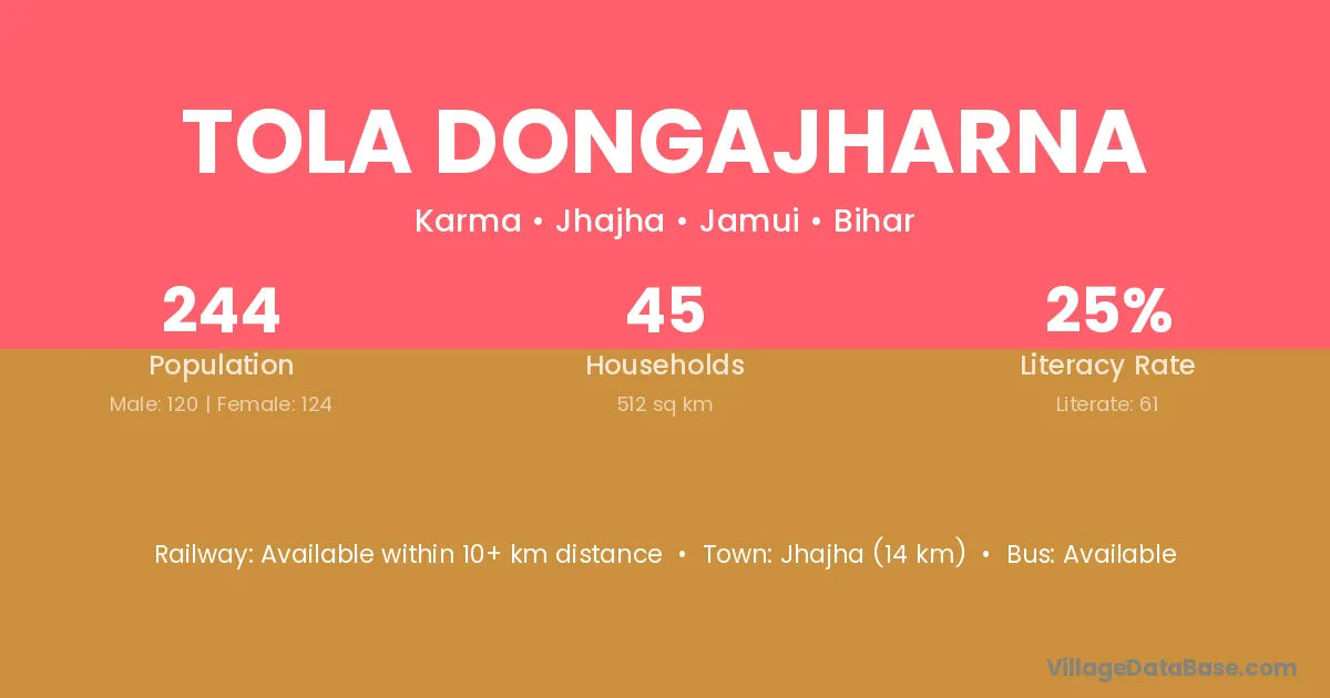 Jhajha (14 km) is the nearest town to Tola Dongajharna village for major economic activities and is located approximately 14 km away.