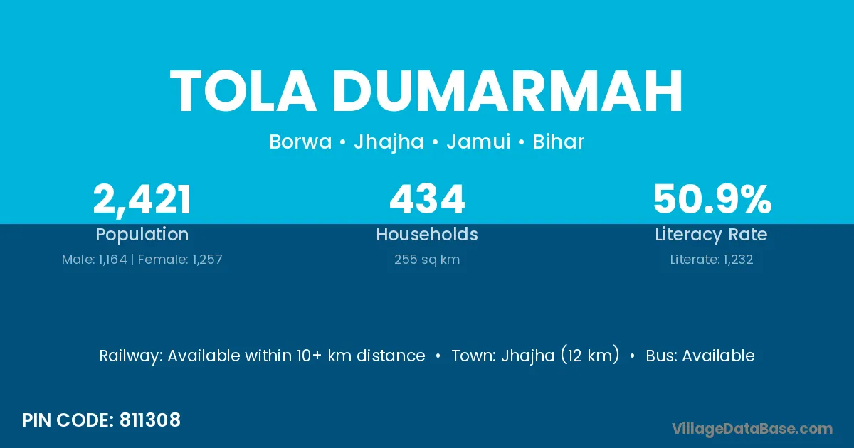 Jhajha (12 km) is the nearest town to Tola Dumarmah village for major economic activities and is located approximately 12 km away.