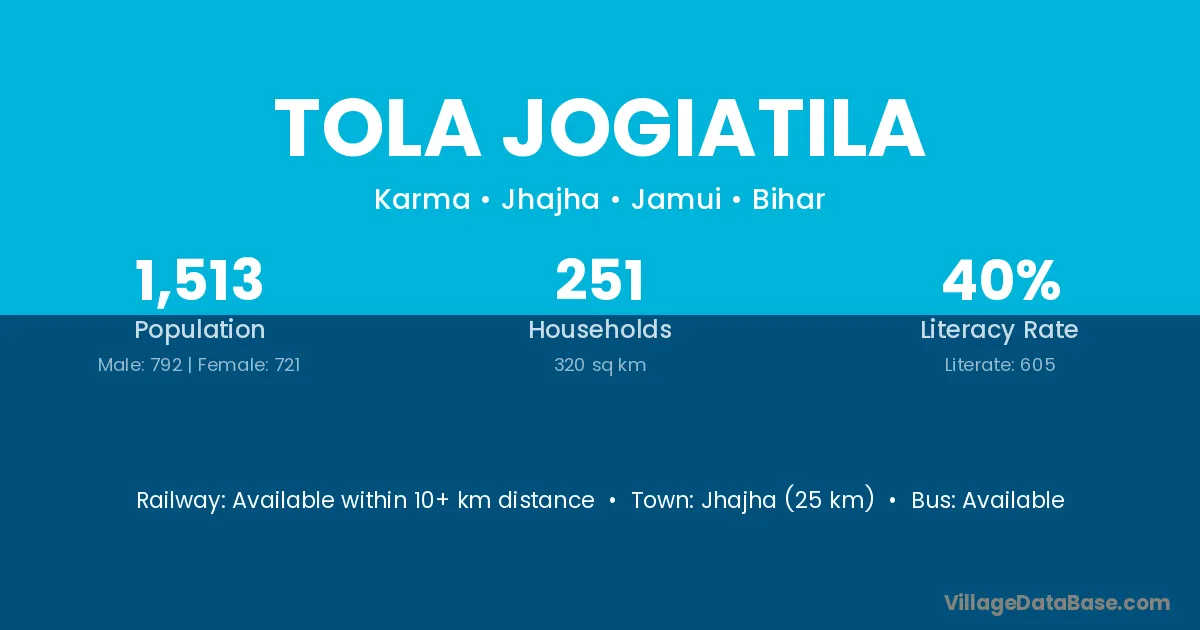 Jhajha (25 km) is the nearest town to Tola Jogiatila village for major economic activities and is located approximately 25 km away.