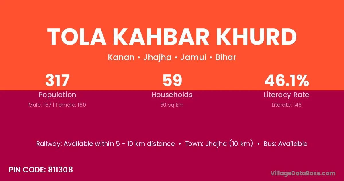 Jhajha (10 km) is the nearest town to Tola Kahbar Khurd village for major economic activities and is located approximately 10 km away.