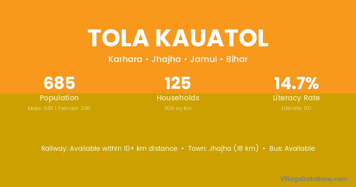 Jhajha (18 km) is the nearest town to Tola Kauatol village for major economic activities and is located approximately 18 km away.