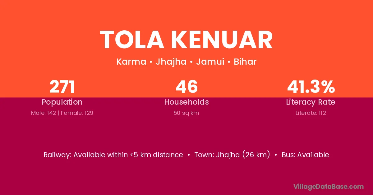 Jhajha (26 km) is the nearest town to Tola Kenuar village for major economic activities and is located approximately 26 km away.