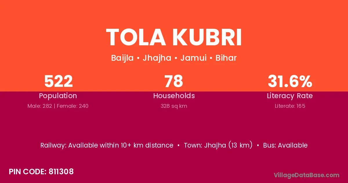 Jhajha (13 km) is the nearest town to Tola Kubri village for major economic activities and is located approximately 13 km away.