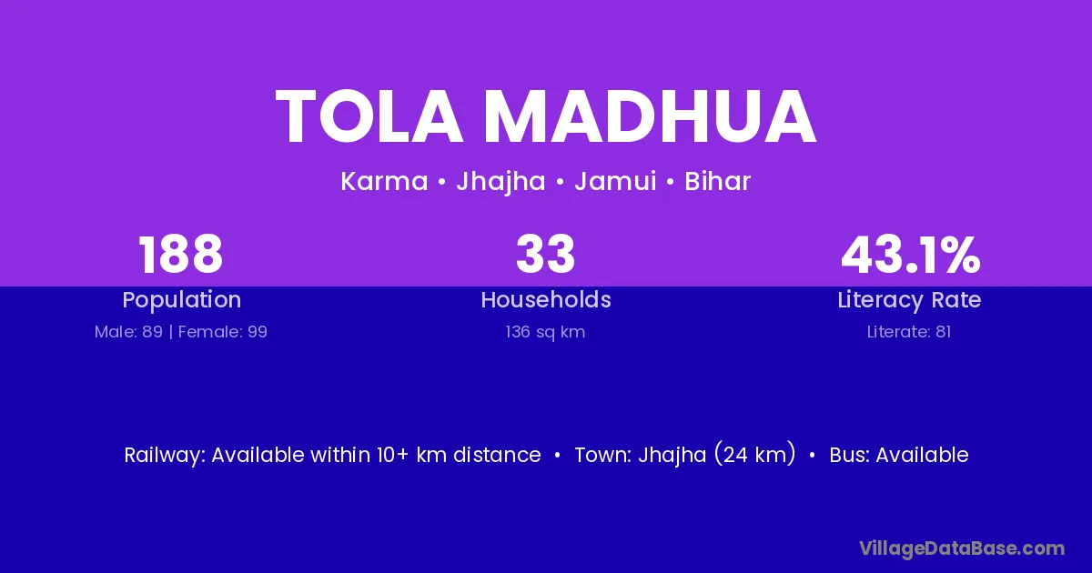 Jhajha (24 km) is the nearest town to Tola Madhua village for major economic activities and is located approximately 24 km away.