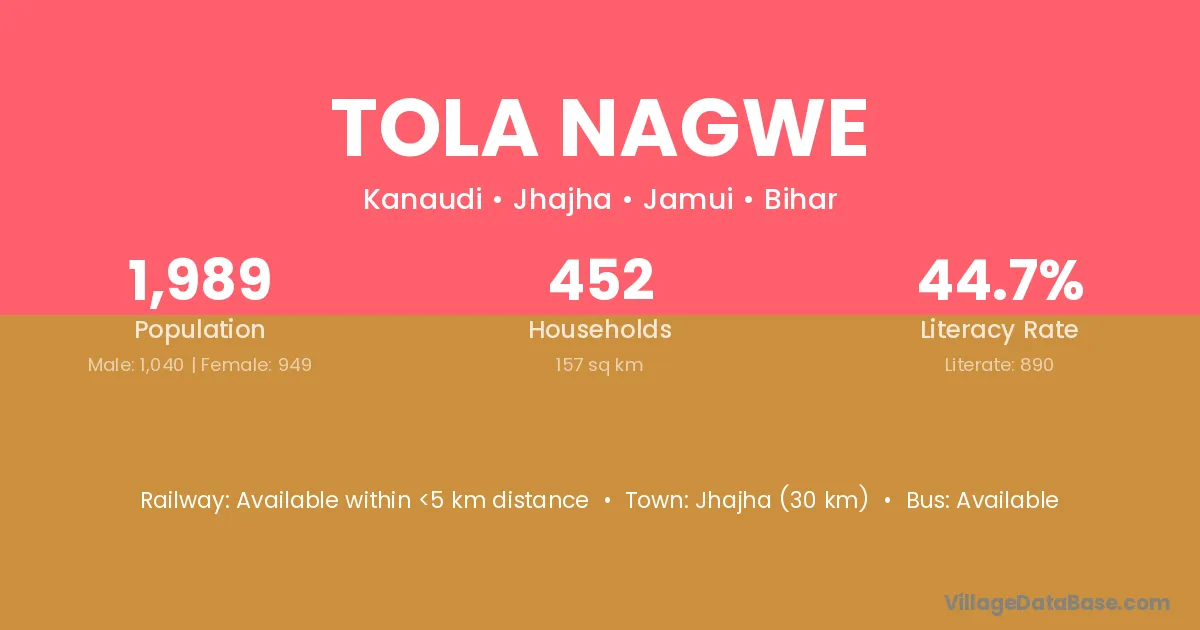 Jhajha (30 km) is the nearest town to Tola Nagwe village for major economic activities and is located approximately 30 km away.