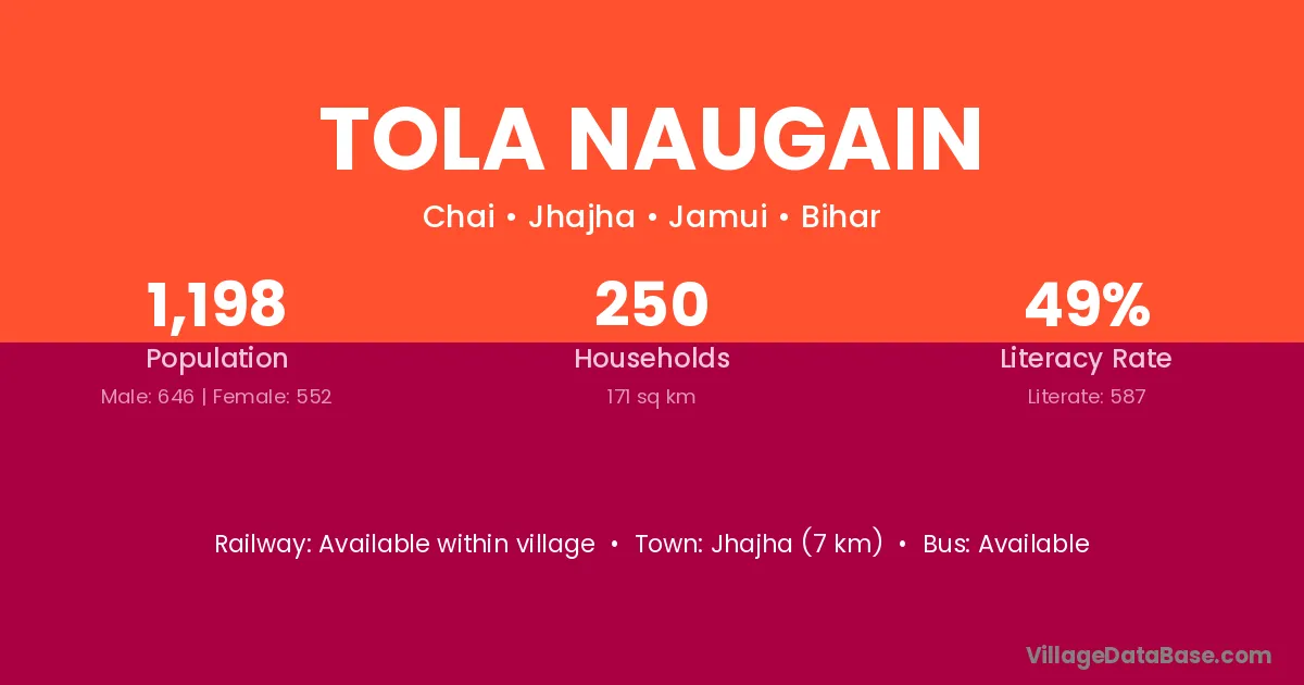 Jhajha (7 km) is the nearest town to Tola Naugain village for major economic activities and is located approximately 7 km away.