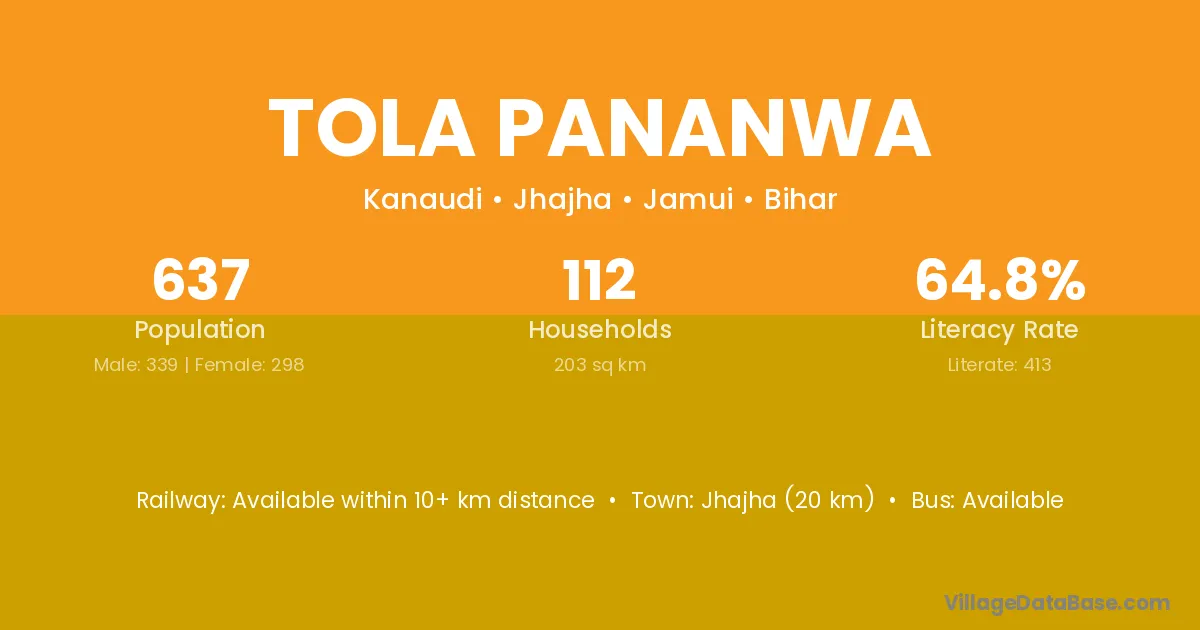 Jhajha (20 km) is the nearest town to Tola Pananwa village for major economic activities and is located approximately 20 km away.