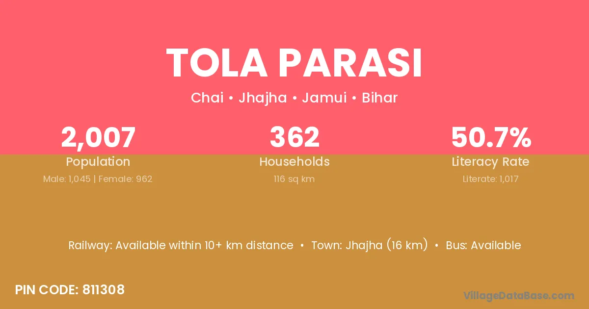 Jhajha (16 km) is the nearest town to Tola Parasi village for major economic activities and is located approximately 16 km away.