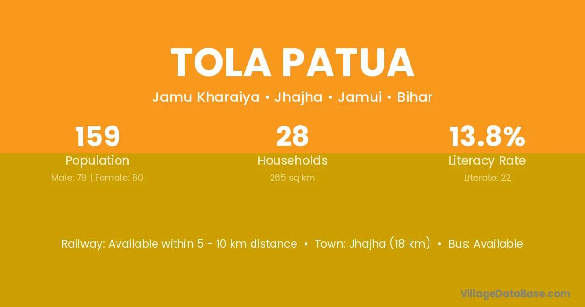 Jhajha (18 km) is the nearest town to Tola Patua village for major economic activities and is located approximately 18 km away.