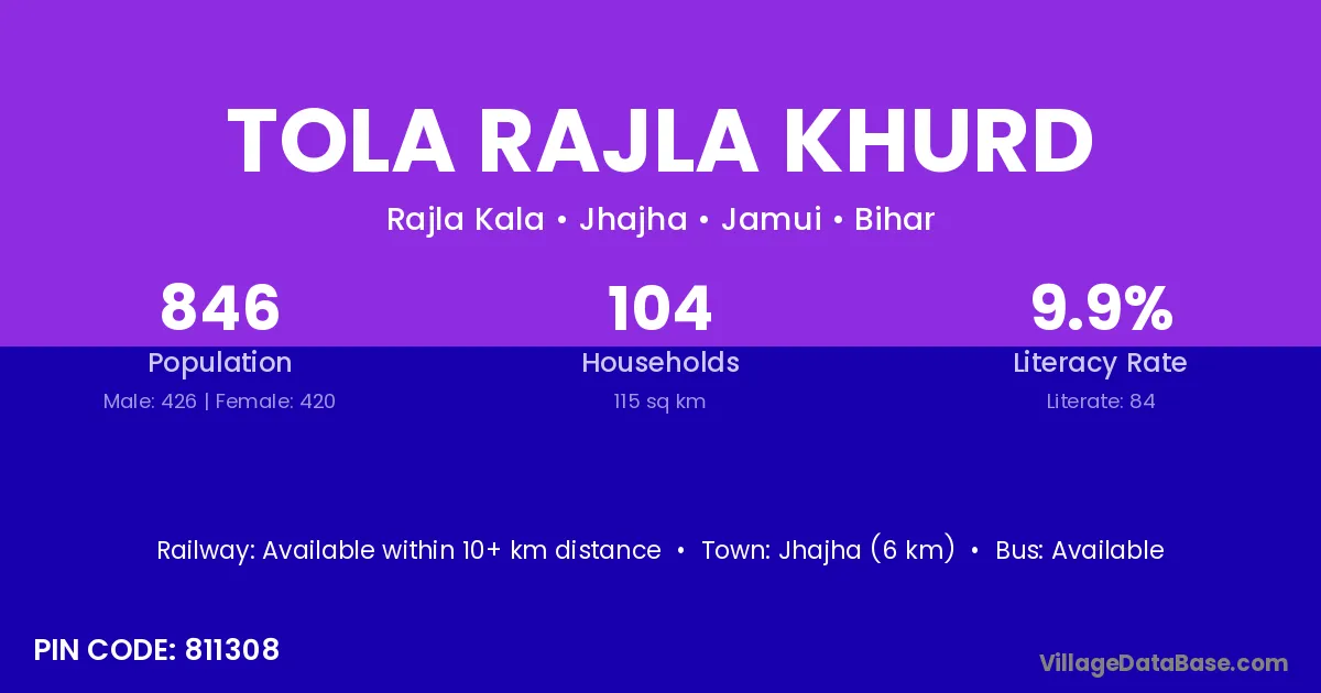 Jhajha (6 km) is the nearest town to Tola Rajla Khurd village for major economic activities and is located approximately 6 km away.