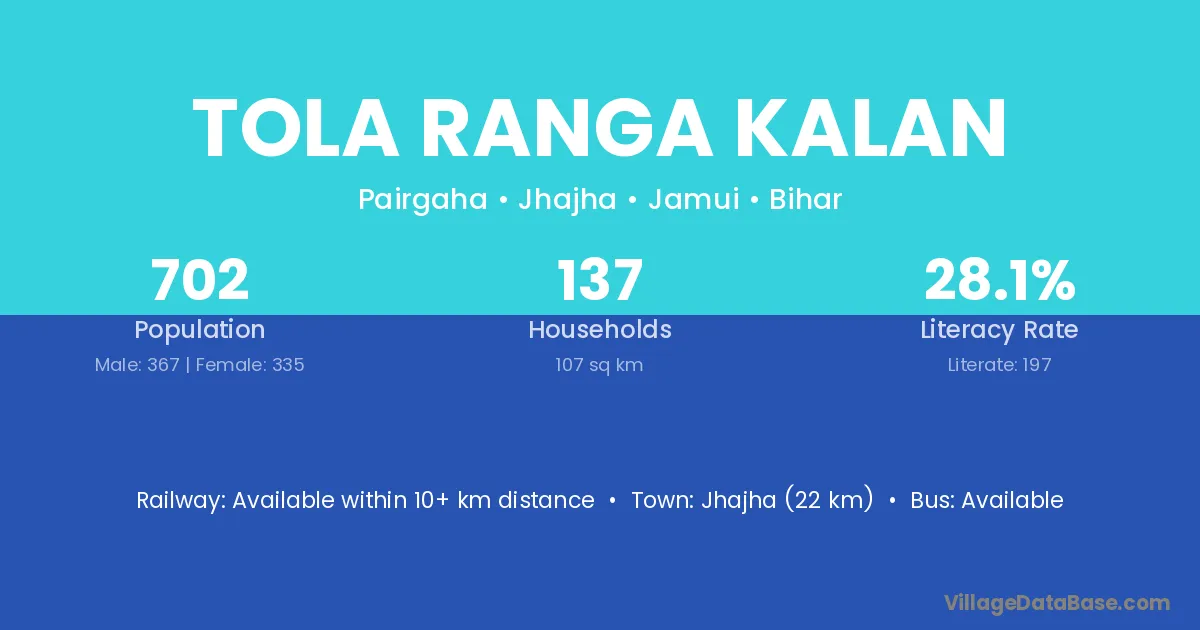 Jhajha (22 km) is the nearest town to Tola Ranga Kalan village for major economic activities and is located approximately 22 km away.