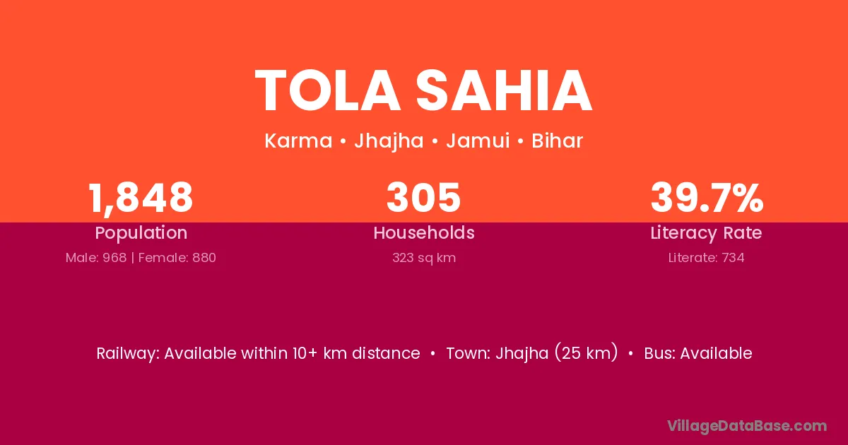 Jhajha (25 km) is the nearest town to Tola Sahia village for major economic activities and is located approximately 25 km away.
