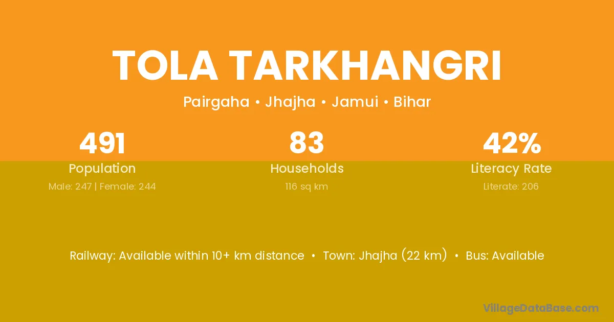 Tola Tarkhangri village has a total population of 491 people, of which 247 are males and 244 are females.