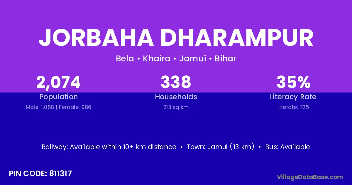 Jamui (13 km) is the nearest town to Jorbaha Dharampur village for major economic activities and is located approximately 13 km away.