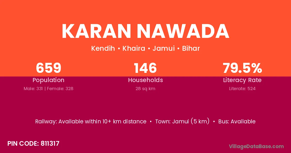 Jamui (5 km) is the nearest town to Karan Nawada village for major economic activities and is located approximately 5 km away.