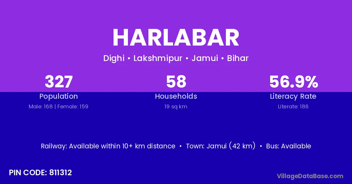 Jamui (42 km) is the nearest town to Harlabar village for major economic activities and is located approximately 42 km away.