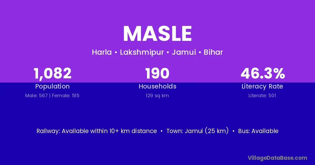 Jamui (25 km) is the nearest town to Masle village for major economic activities and is located approximately 25 km away.